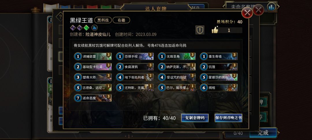 套牌颜色:黑黑绿 诱捕诡雷x3 G (1) 尤特斯,无面蚀智者x1 BB (5) 受诅咒的信徒x3 B (4) 蒙娜莎的拥抱x2 G (5) 返命恶魔x3 BB (7) 饥饿x3 BB (2) 重生骨墙x3 B (1) 地下街处刑者x2 B (4) 食腐渡鸦x3 BB (2) 塑骨大师x3 B (3) 揭棺x2 BB (6) 纳萨克斯,不死者x1 BB (2) 无瑕圣角x3 G (1) 恐惧手杖x3 B (1) 巴尔,黯夜魔王x1 BB (5) 古德桑,远征军首领x1 G (5) 基础型卡拉诺x3 G (2) 套牌码:l8x6eMcS2RhbHF4WYx/rE+8WAhd3E/sW9hOBE4sWExSZGyEYrxI= 如果要使用这副套牌,请先将套牌码复制到剪贴板,然后在“达人套牌”里点击“使用套牌码”进行粘贴。