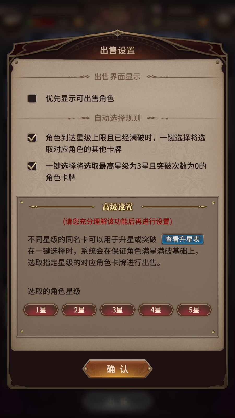 ※关于<高级设置>,通俗的解释就是系统会在计算同名角色满星满破之后再选择多余角色进行出售。