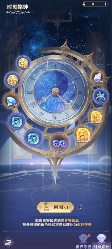 它可以将过去的经验化为能看得见的物品,像我轻轻拨动了一下就拿到了许多东西,看来书上说没错:时刻铭钟记录着提亚大陆的变迁,也会记载成长历程,从历程中产生出的额外经验将可在此钟完成回溯,获得时间女神相应的奖励。