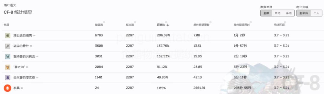 所以我查询了企鹅物流,并且引入了一个“炼金值期望”的数据,在消耗理智相同的情况下,炼金值期望越高,这关的性价比就越高。