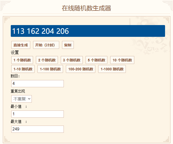 最后进行随机抽奖,在1-249中生成6个随机数: