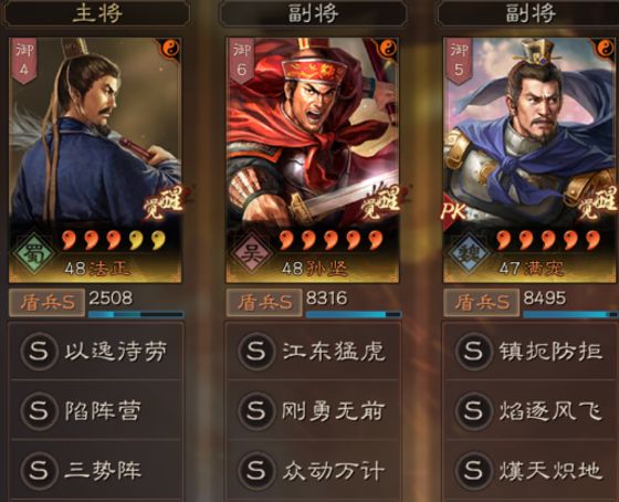 三势阵:战斗前五回合,主将自带战法提升16%的发动概率,每回合行动前使损失兵力较多的副将获得30%免伤,另一名副将获得25%增伤。这队最看重法正自带战法的发挥,所以必须给法正提高自带战法发动概率。同时给予副将的增伤减伤,不管给到满宠还是孙坚,都是不亏的,因为两个副将都需要输出,都需要减伤。