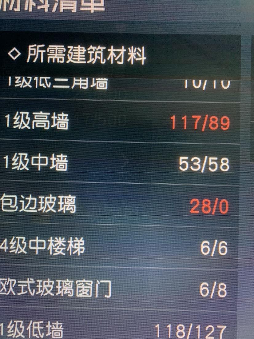 反映一下游戏内的迷之事件 材料收集齐了后生就成实现到基地里了 现在已经都不缺了 我就给建筑升了一下级 然后想着在进入蓝图模式看一看 结果进去后它为啥又显示我却材料 我都建造好并且实现了 别的不说 这28块包边玻璃 还有1级挂梯 而且包边玻璃我都升到4级了 1级挂梯也升到4级了 可它现在不仅显示我没有 还显示是1级 你看看别的有些都显示我升到4级了 我已经点击过替换结构了 还是显示没有