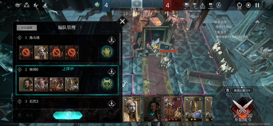 3.大佬视频中放跑一个弓舞者的思路真的很好,我这里也采用,第三回合雷蒙德最先行动放技能给队友回血,并且统帅开护卫堵住下方两个目标点,到此雷蒙德和统帅一直挂机就行。