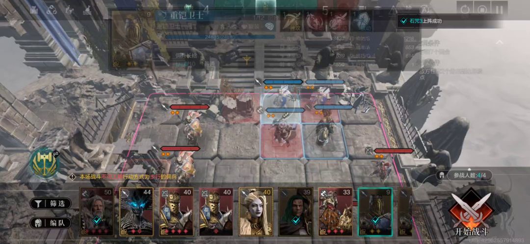 注意点:1.因为左上方是2只枪兵,为了尽量减少伤害,原来阿斯光年r大佬在第一回合是选择重铠卫士和守卫者来阻挡这两只枪兵,但是守卫者是剑兵,会被枪兵克制打更多伤害,所以我把守卫者换成重铠卫士,2只重铠卫士互相分摊伤害,可以更加降低练度。