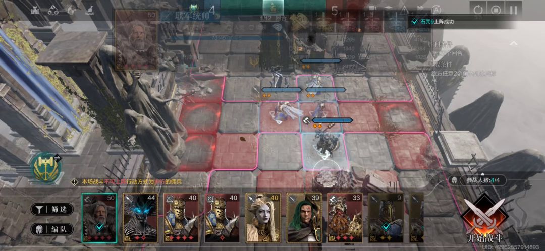 2.与大佬不同的是,第一回合和第二回合的人物站位我都保持不变,尽量减少操作,最主要的是第三回合开始下方生成的兵种不能是法师或者弓兵,我们的单位很难抗住这两种兵种,所以利用回溯机制凹出来近战兵种,但是打下来发现第三回合生成法师的几率还是挺高的,所以需要多回溯几次。还有一个点就是右上方有可能会生成鹫龙骑士,这个会打我们统帅,降低治疗量,还是比较烦的,如果统帅练度高的话可以无视。