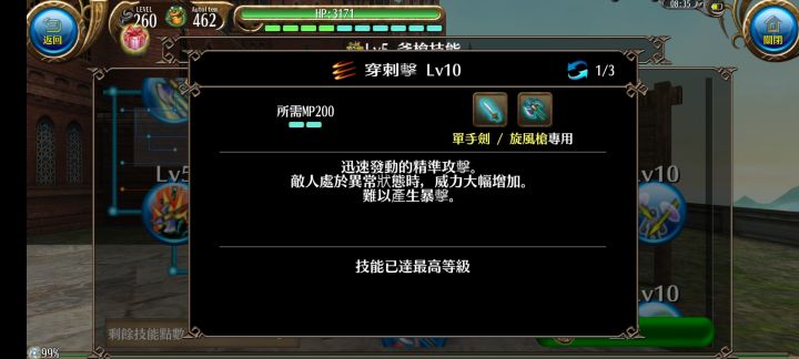 穿刺击:挂异常后倍率大概1500%,虽然是个二阶技能但动作快蓝耗低,在敌人有异常状态时候伤害大幅度提高,因为枪能让BOSS全程处于异常状态让穿刺能发挥最大实力,所以穿刺变成了枪的主要输出技能之一。