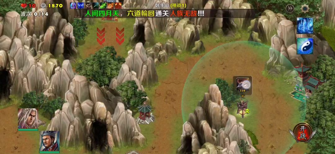 打法思路:全程14波没有空中部队和投石车,我们可以在出兵口位置建造剧毒箭塔后面建造狙击箭塔进行遗漏收割,战斗开始以后把两位英雄调到右边出兵口靠左边的位置刚好荀彧和郭嘉可以打到刷兵营地。郭嘉技能不要停全程就算有遗漏的兵也很少一两个出兵口的防御塔可以轻松收割,当然金币留着也没用就把其他地方都铺上防御塔就可以挂机了