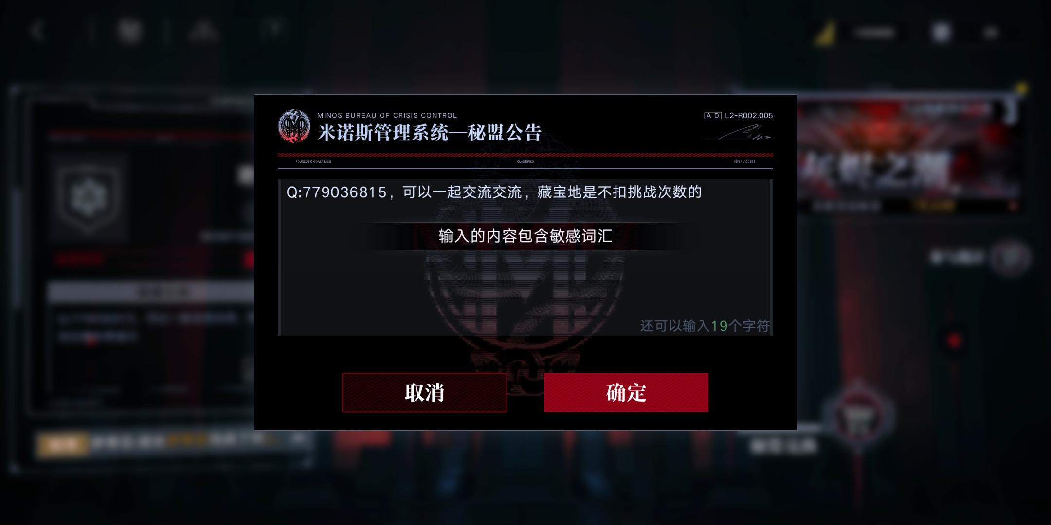 在吗,我要怎么才能提醒我的成员们藏宝地不消耗次数,而且不同的藏宝地可以一起打?我都发啥了就敏感词汇了。。q早就放在那了肯定不是它的问题,那是啥呢。。。不止我截的这两个图,我试了好多个。。。能不能告诉我敏感在哪了,以后有敏感信息给个提示哪敏感了可以吗,好影响心情啊