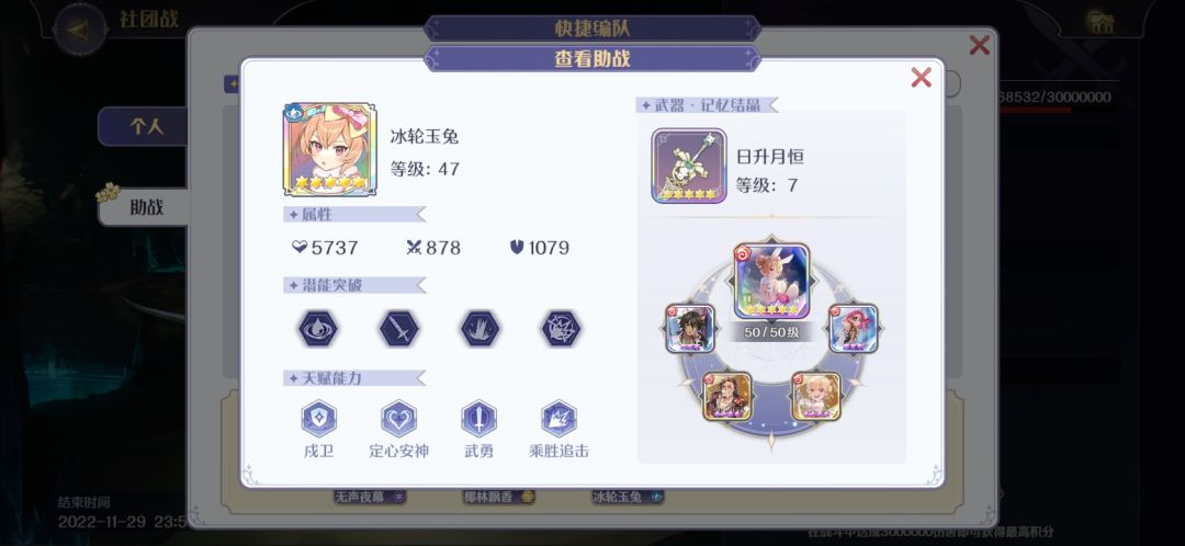 2.从2022年6月8日开服第一天,到2022年10月4日期间的社团战,此时游戏已推出了风枪萨拉、水剑米尔德里德、暗炮多洛提亚等热门跨属性,能打出超高额输出的角色形态。其中,风枪和水剑是玩家反馈大加强的,多洛提亚是紧接着风枪和水剑之后推出的下一个新角色形态。前文已提到,为了维持新角色之间的平衡性,多洛提亚的输出得与风枪和水剑接近。只要在游戏中有至少一个中配置(0破本体+90级满破5星主结晶+若干副结晶)的角色形态,能够支撑团队跨属性打足一个BOSS的满分。再加上开始玩的第一天积累到社团战期间的限时活动,所赠送过的满破角色、满破结晶、以及完成30天新手任务获得的SSR角色形态*2、还有新手角色50抽和其他资源共同打足其他两个BOSS的满分,那么平常积极玩的,社团战3组BOSS不追求超杀,只要想打,每天都打足650积分其实不难。
