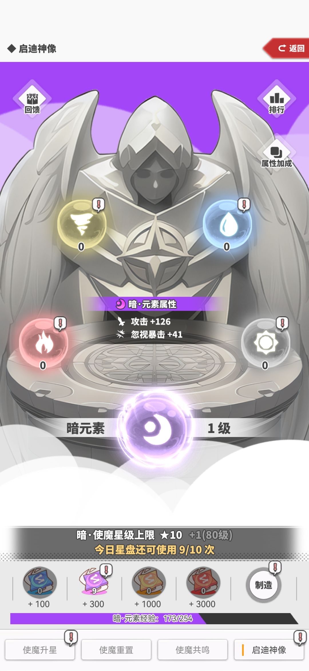 通过使用星盘提升风、火、水、光、暗属性神像的等级,获得属性加成。