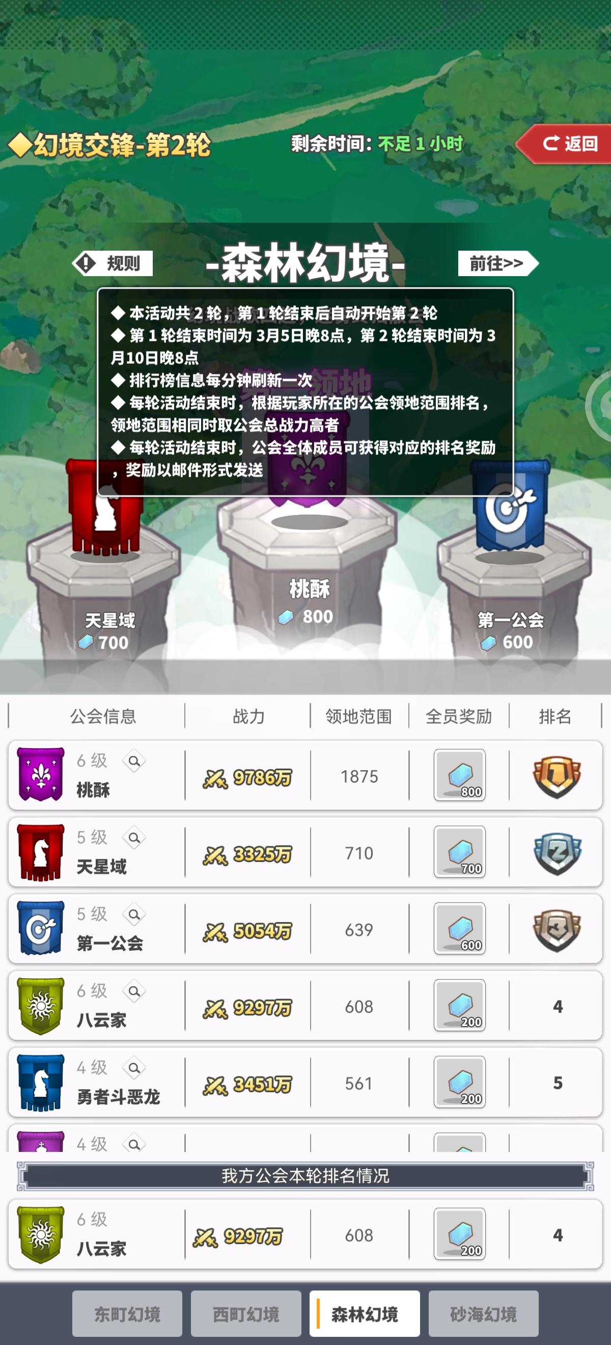 参与2期活动期间,我公会已于3月9日晚拨除天星域和第一公会,驻扎地都飞掉了,3月10日5点道馆领地更新,此时两公会已不存在于排行榜上,正如我所说,9日当晚已拔除。
