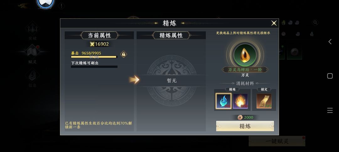 刷出高百分比属性可以用锁灵符进行锁定,下次精炼不会刷新已锁定的属性,锁定属性精炼需要消耗的灵源也会随之提高。