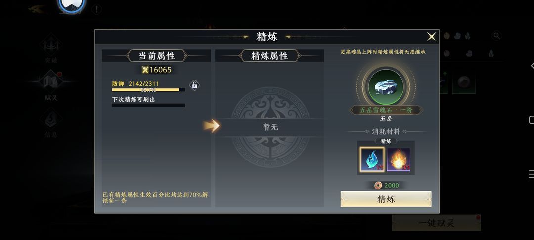 魂晶精炼需要消耗灵源,不同的精炼属性达到指定百分比,下次精炼会另外刷出新一条属性,目前发现的基本都是百分之七十与七十五。