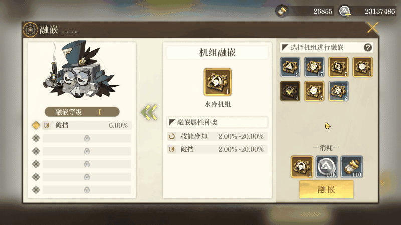 机控室以及寻秘远征获取的机组融嵌在原型机上,每一次融嵌将累积融嵌经验,经验满时将会开启新属性词条,经验未满时也会概率获得新属性词条,对于新增或替换的词条,开拓者可以自行选择是否保留融嵌结果。