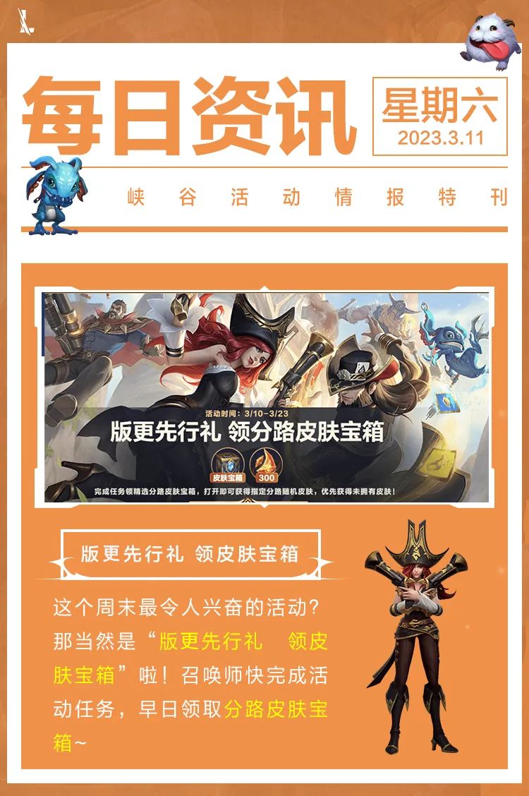 在4.1版本到来之前,有一份免费皮肤福利待召唤师查收!截止至3月23日,召唤师只要参与活动任务,就可以免费获得精选分路皮肤宝箱,可选择开启指定分路随机皮肤宝箱,优先获得未拥有皮肤!