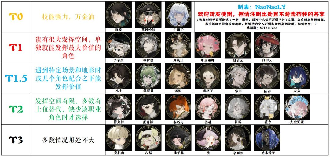 和群友交流之后根据我自己的使用习惯排序,不同的职业之间其实很难比较,各种职业都有需要用到的情况,其中有一些真的很难分级,详细会在角色简评和大家说明,一图流的话如下图,可以转发使用,但是请注明出处。本次测试共29名灵傀,其中15名角色有突破立绘。