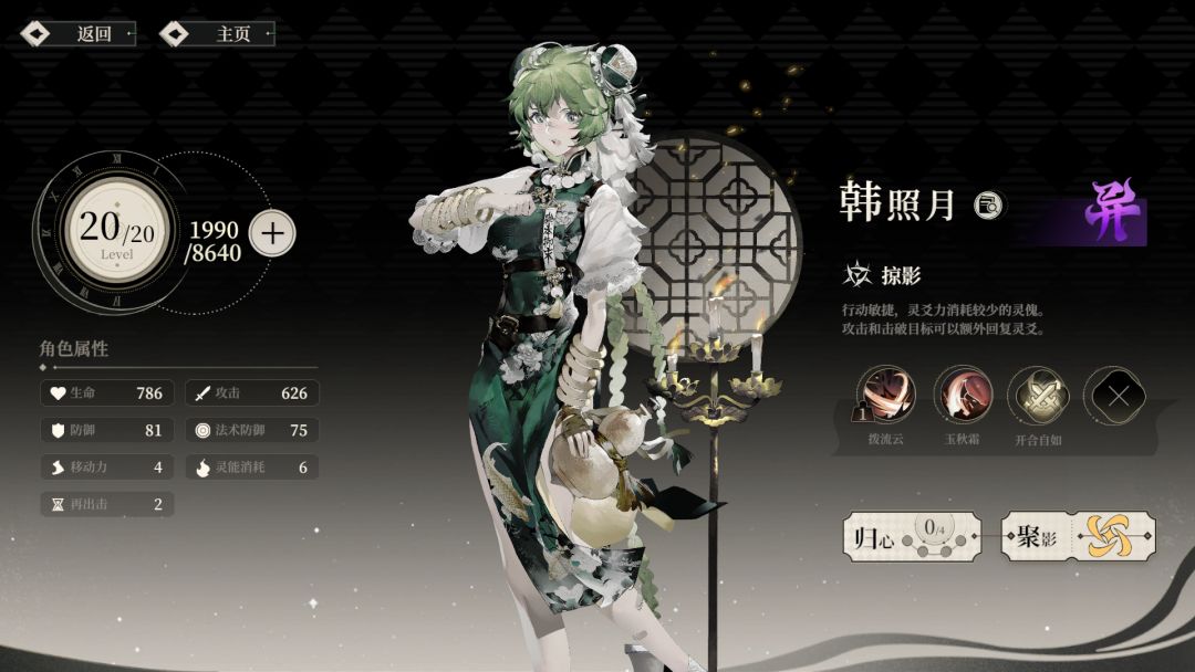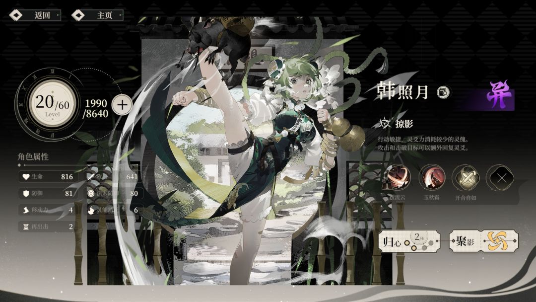 简评:我个人使用都对掠影职业有比较高的评价,一是因为掠影职业都很便宜并且技能大部分可以赚费,对前期帮助很大、韩照月相比唐榛的高回费和强力BUFF、白中云的推2、小七的便宜,主要是侧重输出方面,但是掠翼角色本来就不是非常擅长输出,韩的技能又偏向斩杀,属于收割型掠影,需要好的前期环境,而输出这方面随着游戏进入后期,收益逐渐下降,要么输出再高也打不死怪,要么就是其他人也都能秒,紫卡属性最后也不如金卡。不过由于职业特性,上场下场都很灵活,即使特色不出众带上也绝不亏。