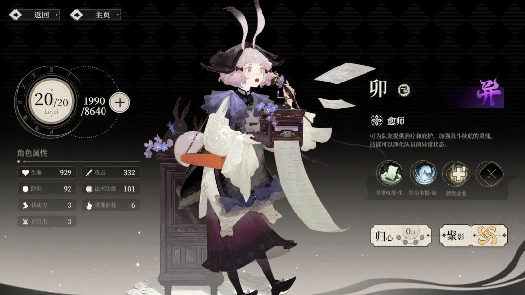 简评:本次测试奶妈的评价都不是很高,一是需要长线战斗的情况不多,并且角色受伤可以直接下场换人,另一方面是灯的血量很低,经常是被一击爆灯,奶妈来不及救,所以愈师整体评级都低,以后有长续航作战的关卡才有比较多的上场机会。卯能增加角色的推力,算有一些用处,增加的20%攻击力不如再上一个掠影补刀,除了禁用掠影的关卡,几乎不会用到。