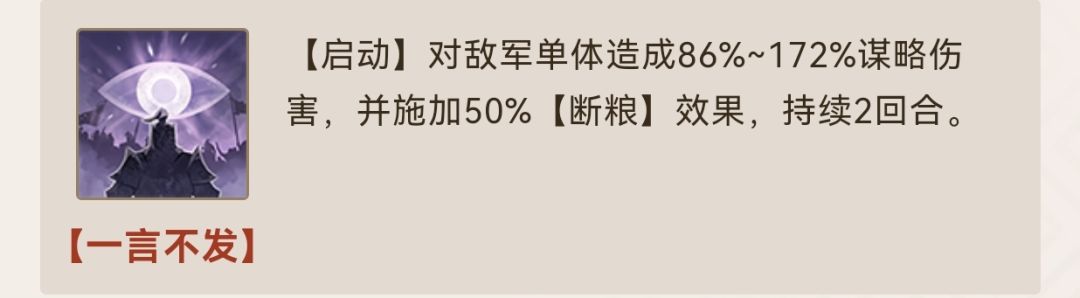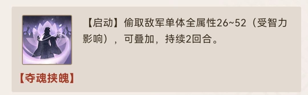 该怎么描述郭嘉呢?遗计定辽东又或是若奉孝在此孤必不遭此败?无论如何三棋也是给足了奉孝面子作为第一法爷s1到底是不是策划投放在预抽卡里面的鸡肋且看此贴细细道来还是先说三围,郭嘉拥有全游第三的有效数值作为法师智力统帅的188初始与7.36成长仅次于诸葛曹操在说自带战法,也是郭嘉真正坐稳第一法爷的根源,双效果一个1回合?0回合的主动单体伤害+超模的被动效果减伤所有战法1回合cd同时增伤20其实郭嘉拥有的这些优势单看效果并不惊艳,一点三围?(那么难抽不容易红也就那样)被动的20增伤?(就加那么点还不如都督的几个神火金色个性叠加呢)一回合cd减少?(张辽吕布一刀给你秒了没爆发减伤回合有什么用)但是这些叠加到一起就让郭嘉拥有了不可比拟的地位通过搭配战法弥补缺点(可是谋略高级战法s2才有啊,真的吗?)郭嘉搭配详解开始,首先战法循环郭嘉由于自带了0cd的主动战法注定常规pvp中郭嘉已经无法携带其他主动战法(具体原因公测大家实际操作一把就能体会到,想要提前相关机制了解也可以加入下方的三棋交流群哦)在只能携带启动或被动战法的前提下郭嘉能选择的战法寥寥无几但是说来“巧合”的是这俩双双加强,一言不发+夺魂挟魄的双启动组合让郭嘉有了超标的点杀能力,主流的输出武将张辽关羽吕布庞德不管是不是弱智面板(吕布:tm你骂谁呢?)被郭嘉夺魂吸走70+全属性的情况都不会再具备秒杀本身就高额统率的郭嘉,配合魏国的庞德等武将几乎可以随意利用一言不发+奇佐鬼谋的双单体爆发进行点杀楼下持续(随缘)更新郭嘉的阵容构建如何根据大环境针对的给郭嘉加上各类挂件应对召唤五虎辽神都督等