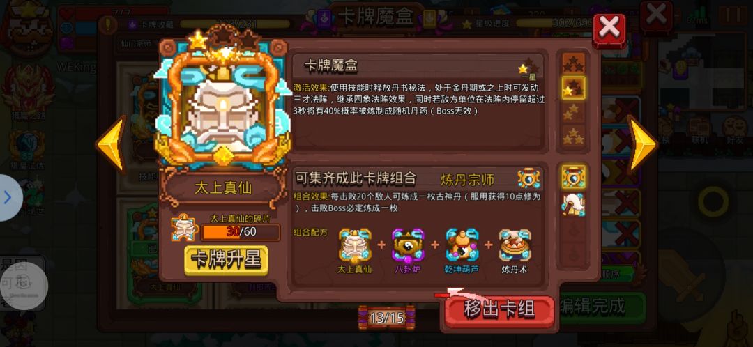 把这个炼丹宗师的组合点出来,然后打的时候只放技能,用那个太上真仙的阵法炼丹,然后古神丹掉落加上葫芦和八卦炉自动炼丹,丹药就会特别多。就像这样