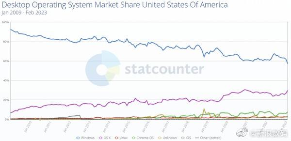 相关统计机构发布的最新数据显示,2023年2月份,Windows在美国的桌面操作系统市场份额已降至57.37%的历史低点,远低于2009年1月92.37%的历史高点。