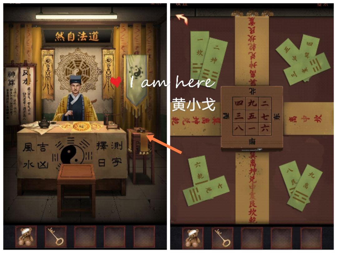 7.(道长房间)点击凳子上面的盒子,结合凳子上的纸张信息和盒子上的九宫图