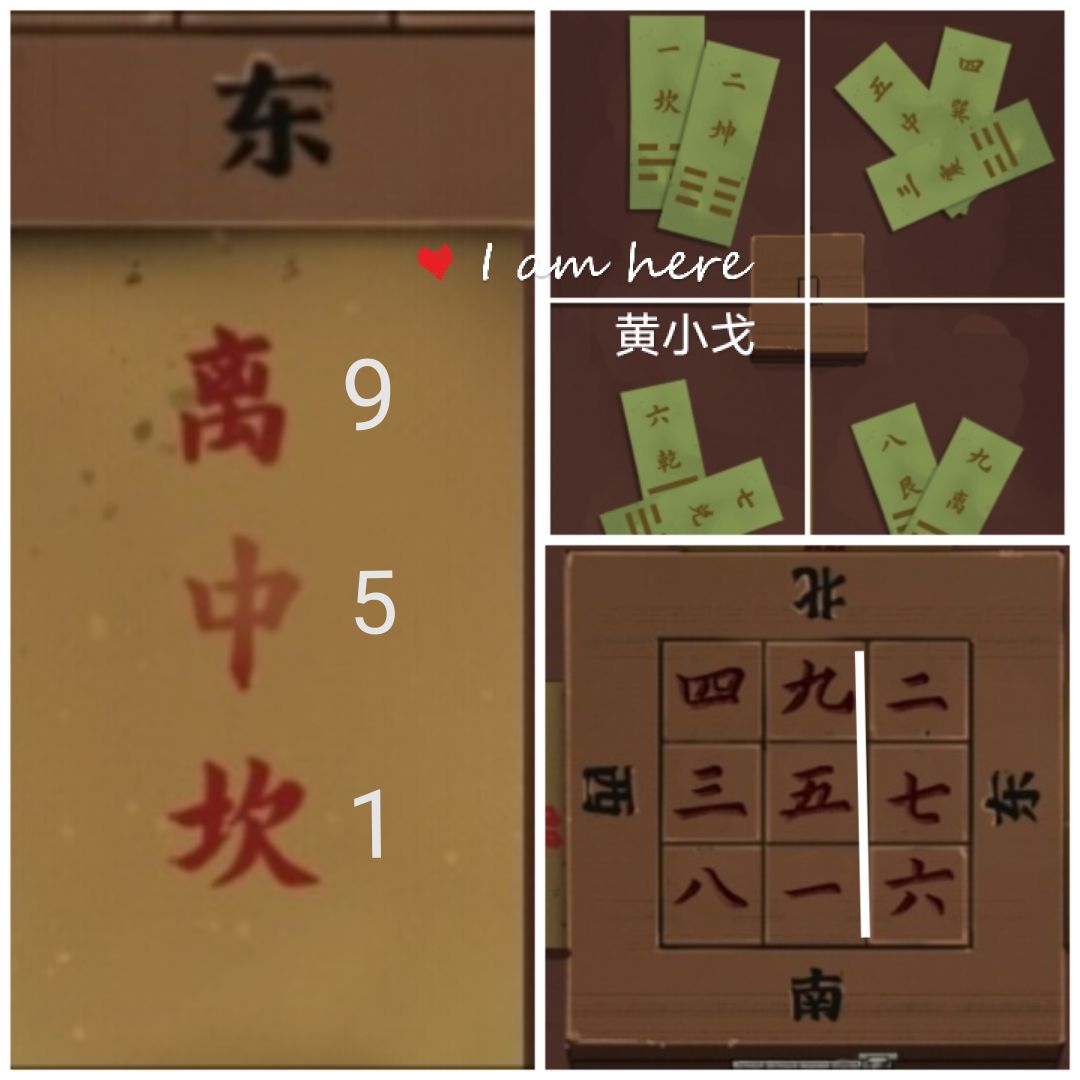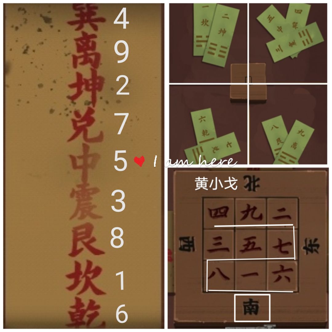 8.推出密码:东1、南2、西7、北0(盒子上的密码锁信息提示北是0,北是巽离坤兑乾坎艮震,结合绿色纸条是49276183,在盒子上的九宫格连起来就变成0、东是离中坎,951,连起来是1、南是巽离坤兑中震艮坎乾,492753816,连起来是2、西是巽离坤兑乾,49276,连起来是7)