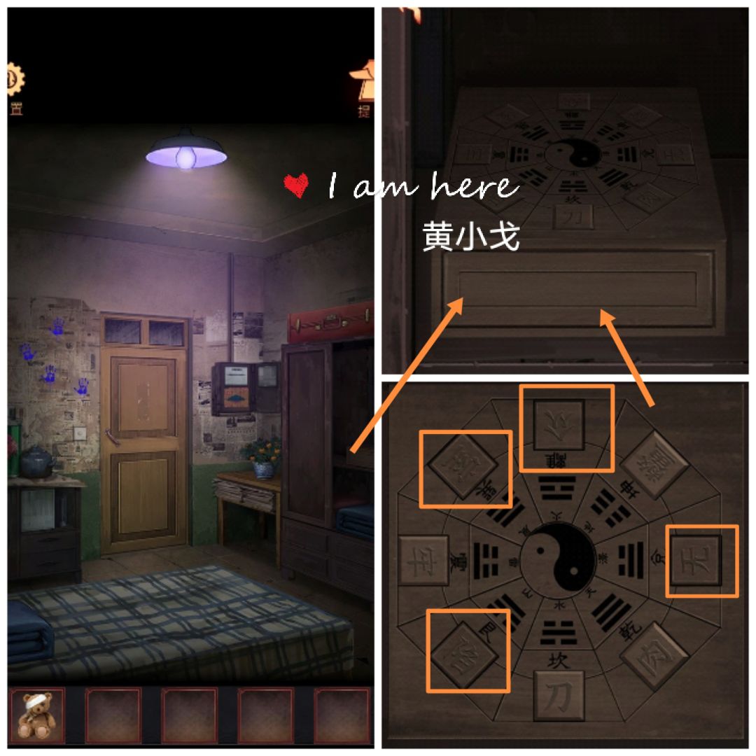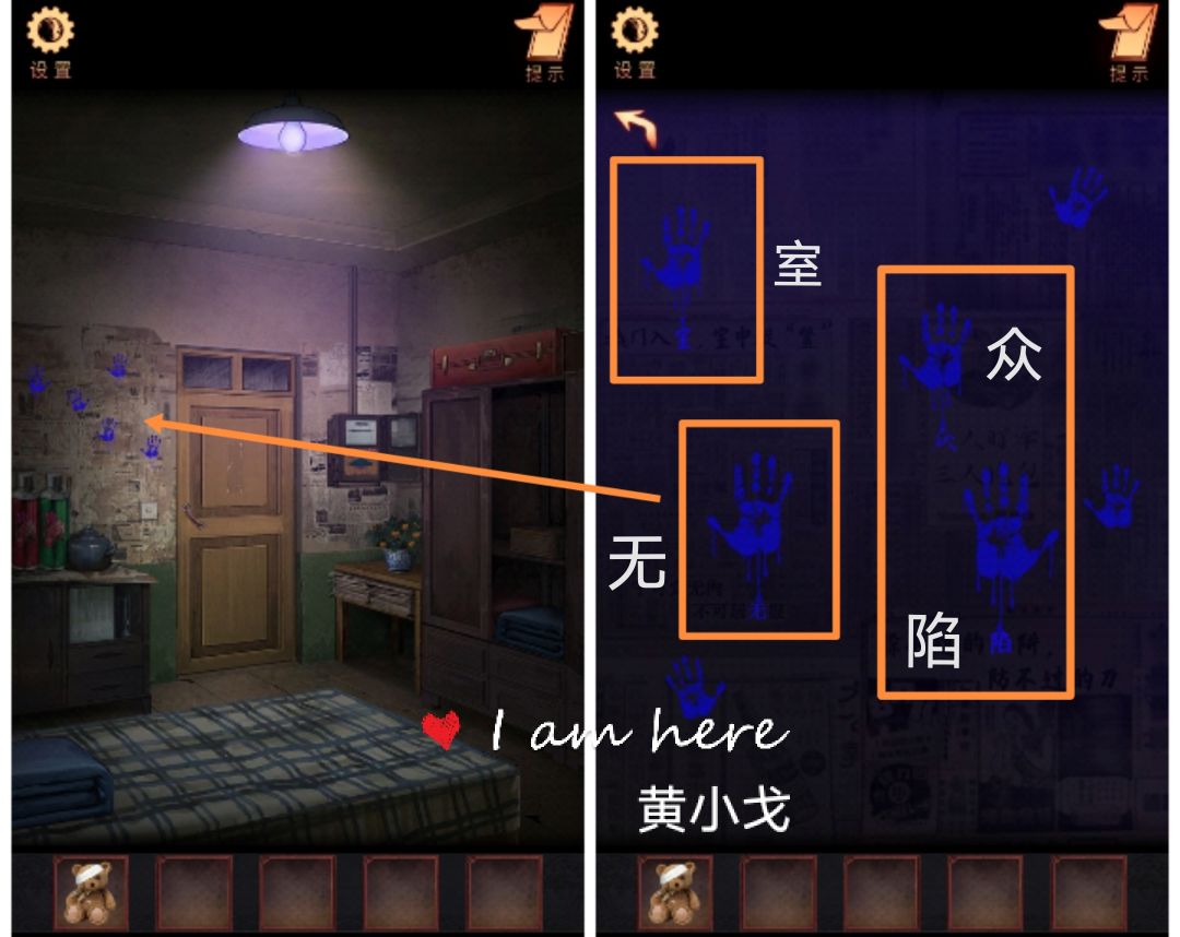3.打开衣柜,点击木盒,根据墙上的信息,按下印有室、无、众、陷字的木块