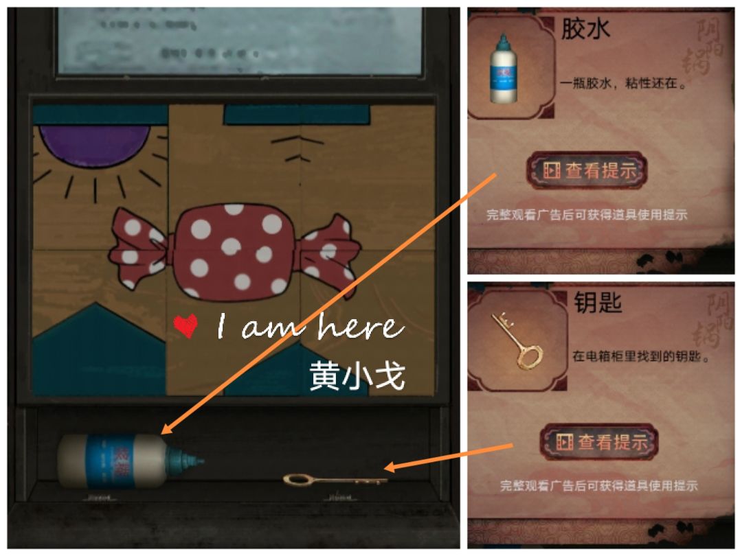 5.点击灯箱,把上面的图案拼成糖果形,暗格打开,获得【钥匙】和【胶水】