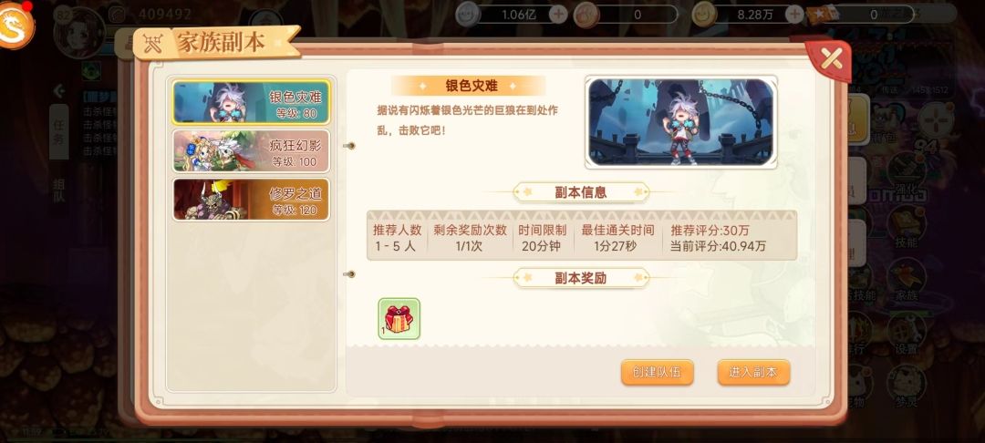 家族副本是达到解锁等级就可以组队刷取的,家族副本就目前只有3个:银色灾难:这个副本需要玩家达到80级解锁,组队1-5人都可进行刷取,完成副本可随机获得任意绿色梦灵碎片*3疯狂幻影:这个副本需要玩家达到100级解锁,组队1-5人都可进行刷取,完成副本可随机获得任意绿色梦灵碎片*6、随机获得任意蓝色梦灵碎片*3、随机获得任意紫色梦灵碎片*3修罗之道:这个副本需要玩家达到120级解锁,组队1-5人都可进行刷取,完成副本可随机获得任意绿色梦灵碎片*9、随机获得任意蓝色梦灵碎片*6、随机获得任意紫色梦灵碎片*5