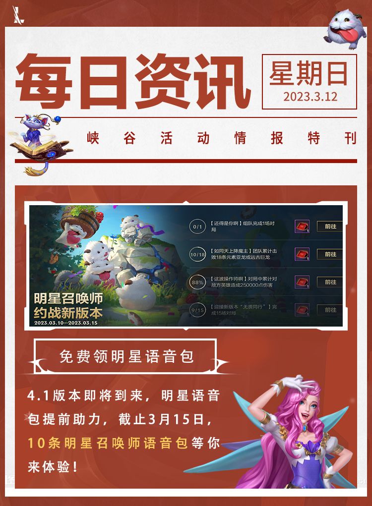 截止至3月15日,召唤师完成指定任务,即可领取10条明星召唤师语音包(30天)。获取全新语音包,在峡谷里与好友畅快沟通吧~