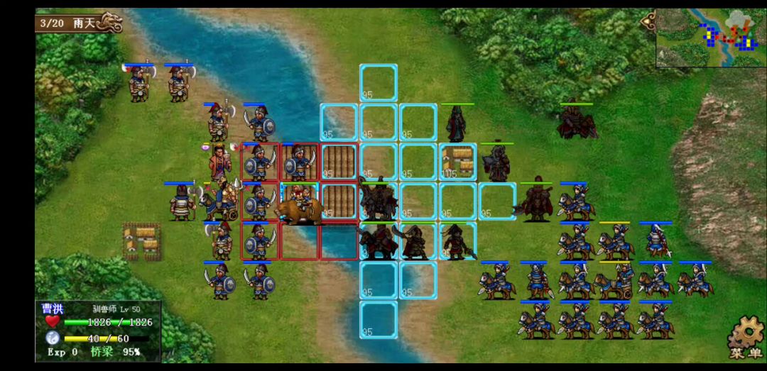 第四回合曹操张任海啸杀死董卓,张合四刀杀死李儒。曹洪曹仁死守桥头,主力全力对付右路骑兵,边打边退保持阵形,中间徐晃乐进,张任张合护住两翼,三大法师在后方输出,敌人都是小短手,没有威胁啦。