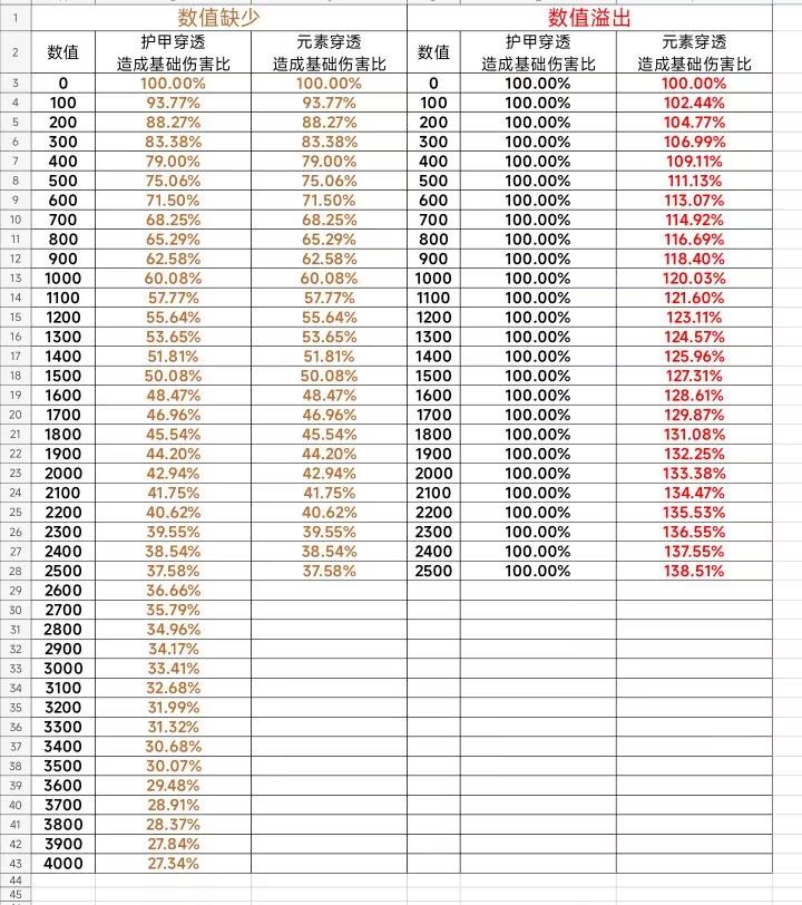 当护甲穿透低于护甲、元素穿透低于抗性时,我们对怪物造成的伤害就会减免,具体关系可以参考下图