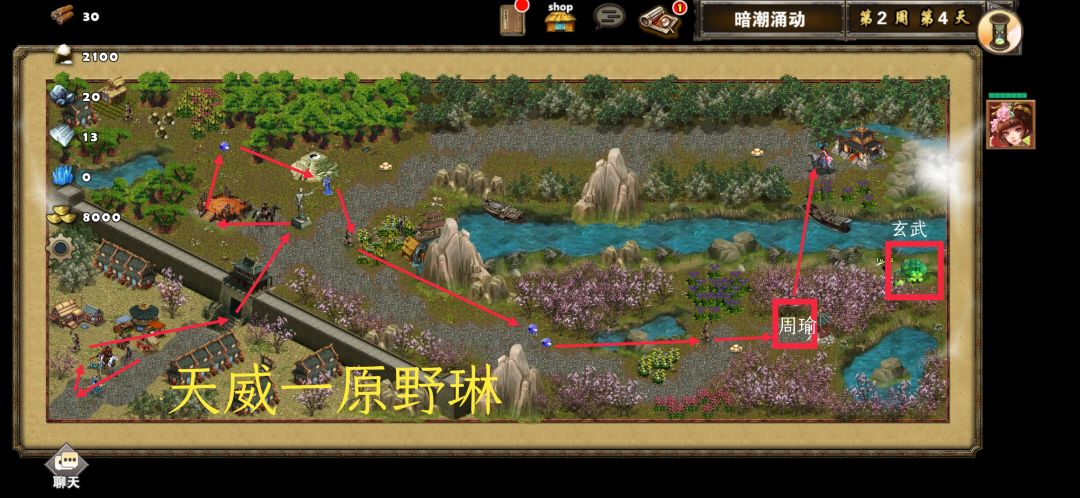 打法思路:开局小乔把家里兵都拿了然后出城点击雕像拿属性,接着去擂台拿体力属性,往上走把属性宝石也拿了,然后去祭坛那里招募散仙往下走把路上的属性宝石都拿了往右边走有个农民和他对话可以打玄武,玄武在最右边花丛里。这里会看见周瑜准备和他打,打之前我们调整下站位小乔被动技能两格内可以帮助我方单位回血所以让小乔站在三号位或者四号位远程兵种贴着小乔站然后就和周瑜开战,打败周瑜以后往上面真周瑜那里跑对话通关。