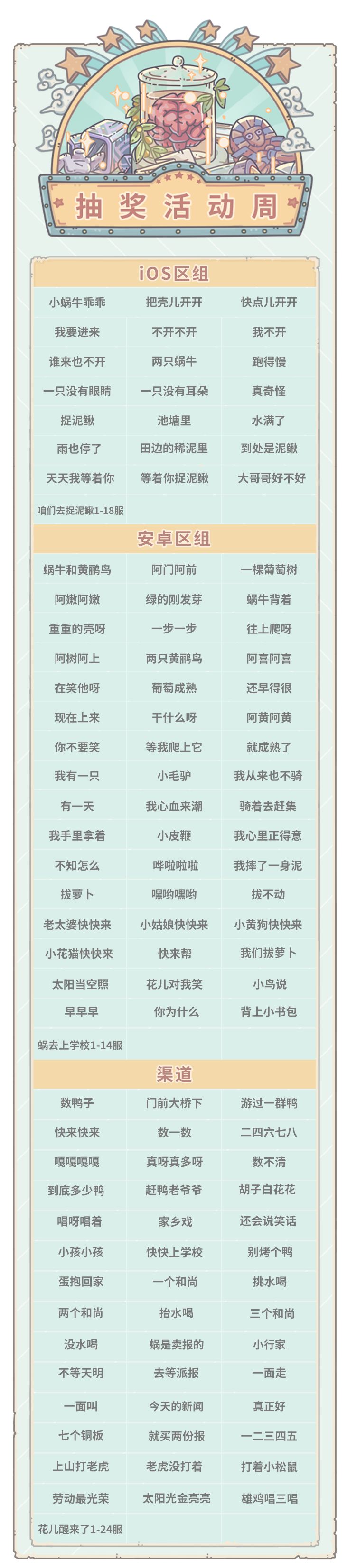 接下来为大家播报本周活动预告!本周五(3月17日)凌晨五点,部分服务器活动将更新为抽奖嘉年华,以下是进入周活动的区组。