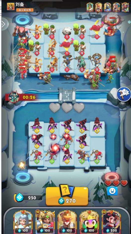 召唤师们使用自身搭配的5个英雄进场对战,每人各有3格血量,不同怪物进入终点会扣除不同的血量,先失去3格血量的一方算输。
