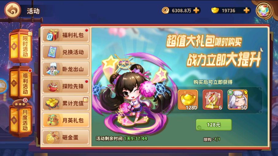 还有月基金128礼包,第二天的奖励就可以获得武将自选箱,各种阵容的核心武将都可以拿到,黄月英当然也在其中啦,每日还能获得元宝奖励,配合神将招募可以获得较多的黄月英本体