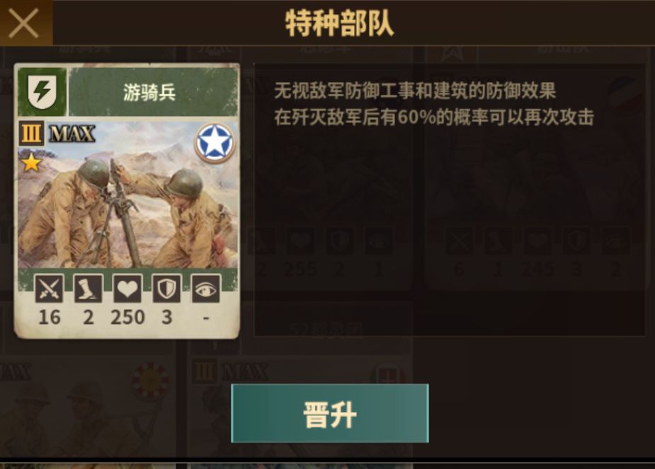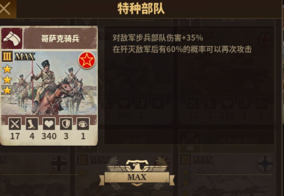 6.特种部队一经配置就不能更换,建议先了解清楚战局状况再决定。不过一般情况建议绑定哥萨克或者游骑兵。