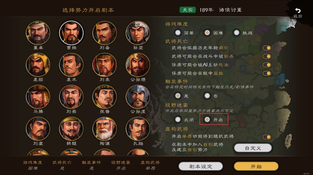 视野迷雾在默认状态下是关闭状态,需要在创建剧本时手动开启;