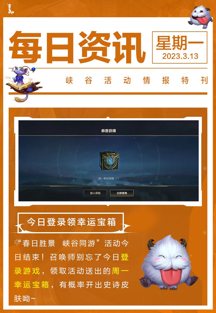 是什么让隆哥彻夜难眠?又是什么让隆哥紧张擦汗?原来又到了周一幸运宝箱开启的时候了!召唤师快来登录游戏,在“春日胜景 峡谷同游”活动里领取周一幸运宝箱,有概率开出史诗皮肤哦~