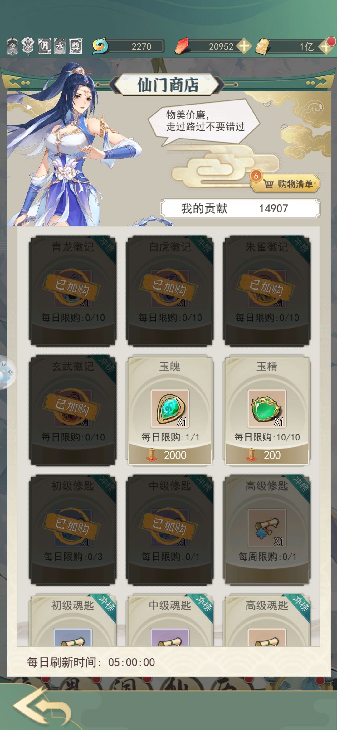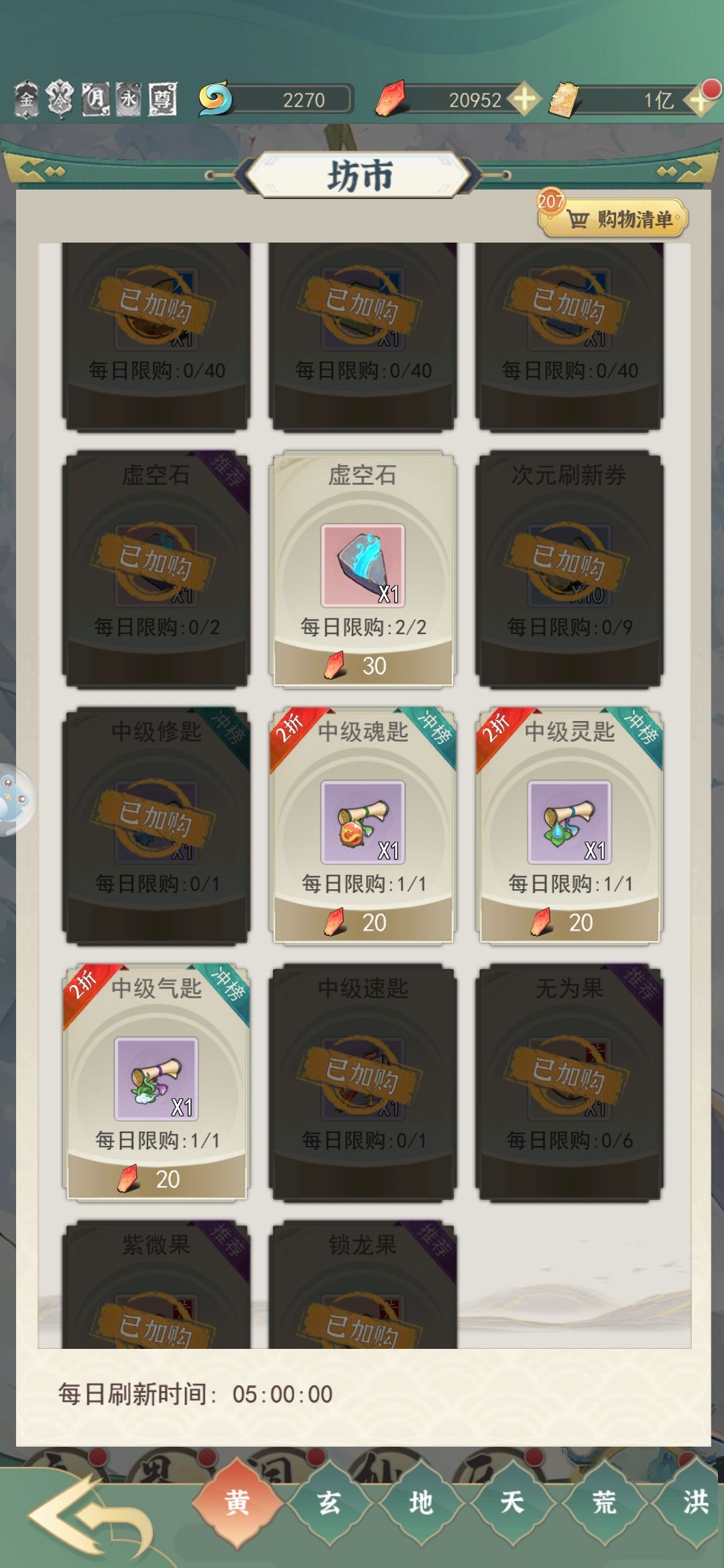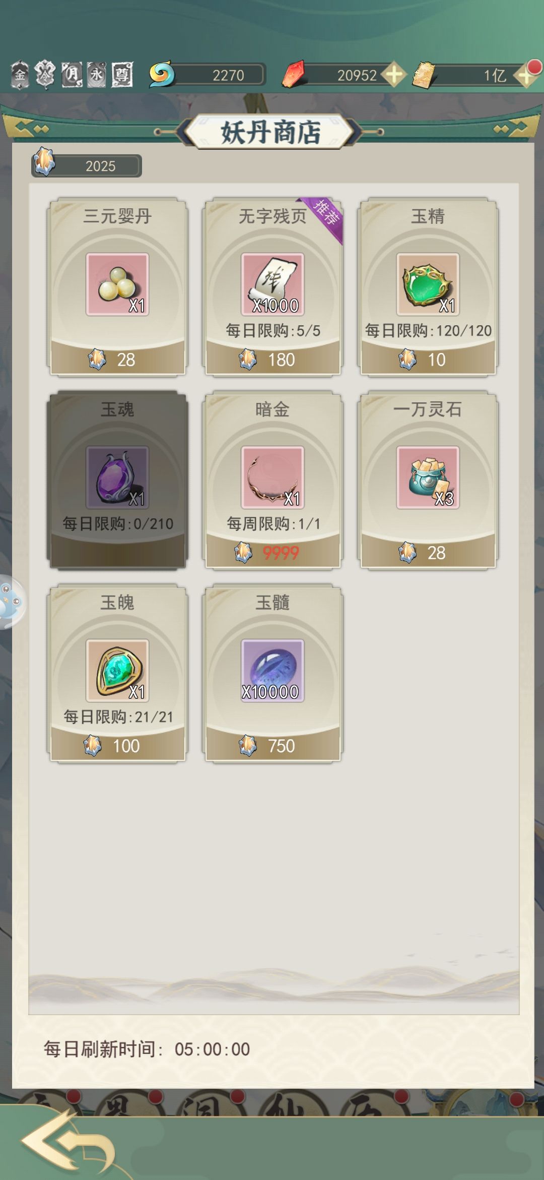 用灵石购买的全都买,虚空石买到上限就可以取消了,各种草药到灵界后也可以取消了,属性丹建议买到上限也接着买,等玉人瓶等级上去了就可以直接吃了。