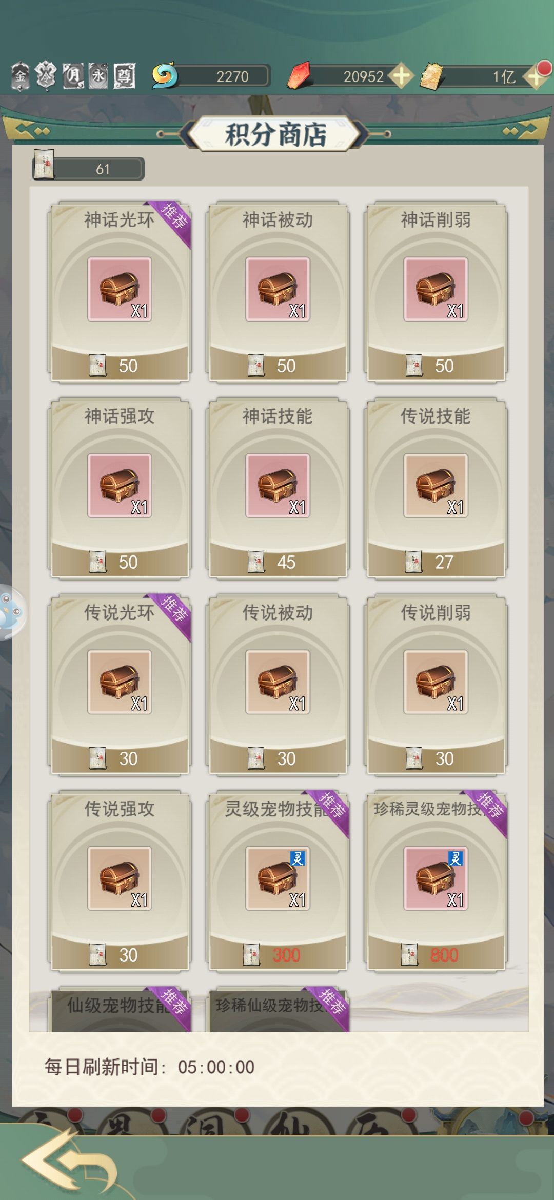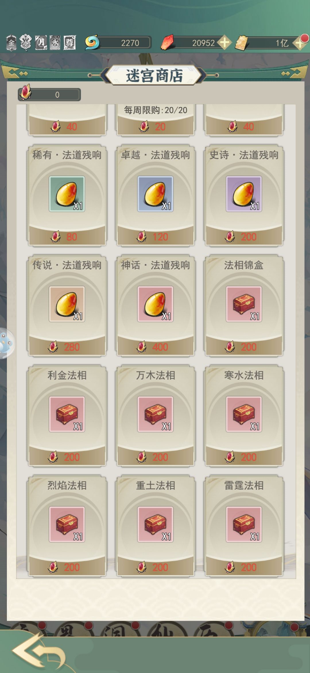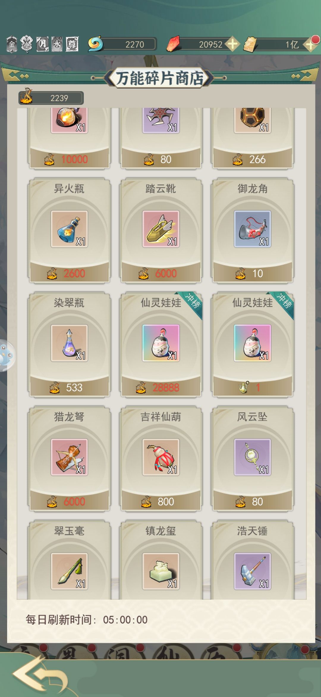 用灵石购买的全都买,虚空石买到上限就可以取消了,各种草药到灵界后也可以取消了,属性丹建议买到上限也接着买,等玉人瓶等级上去了就可以直接吃了。