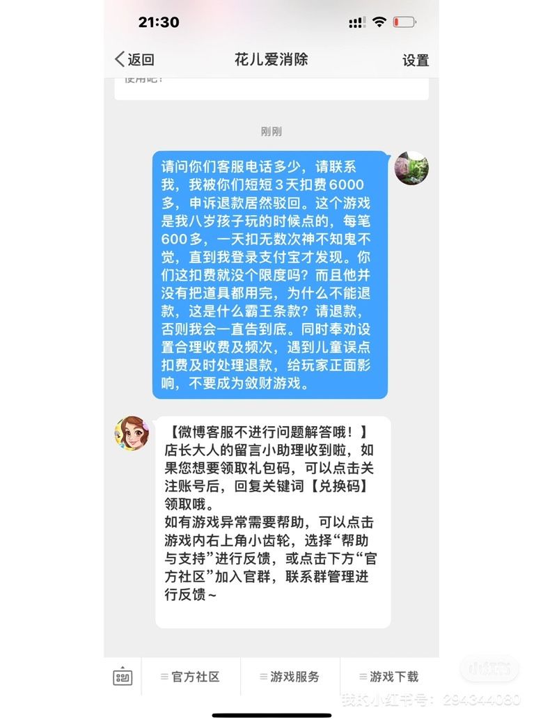 这两天联系苹果公司三次,每次他们都说不要着急我们会处理的,最后退款的申请还是被拒,让我直接找游戏方。但是我连他们的客服电话都找不到,苹果公司也说找不到。我就纳闷了,这是有多心虚,害怕!孩子充值后并没有把道具用完,为什么不能退款?