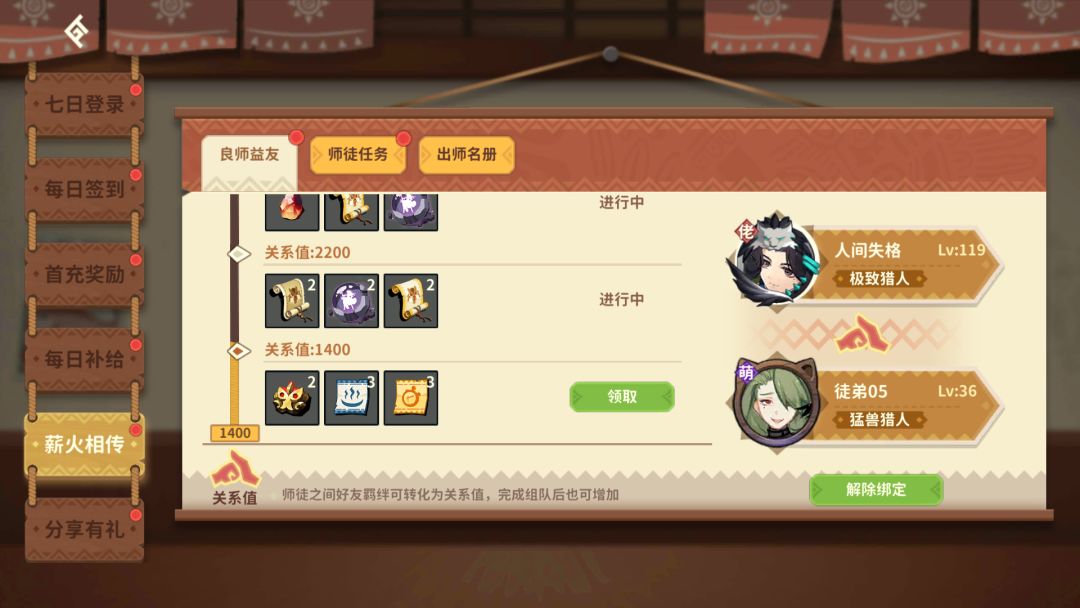 师徒关系值:绑定师徒关系后,将会拥有师徒关系值,当关系值达到固定值,将会获取对应丰厚奖励哦!