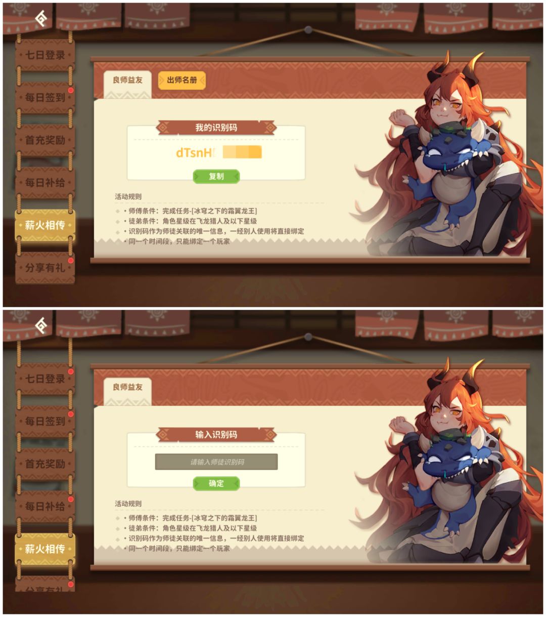 专属身份识别码:每位满足要求的奇迹猎人都将拥有唯一识别码,萌新玩家只需输入专属识别码进行绑定,即可拥有强大的师父带领共伐巨兽啦。