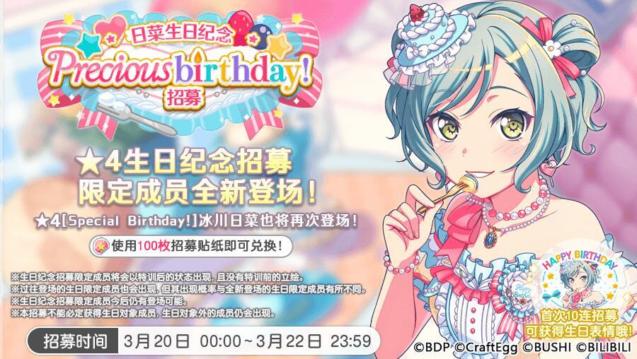 ※在本招募中出现的包括「★4冰川日菜[Precious birthday!]」在内的所有冰川日菜成员都将会比同稀有度下的的其他成员出现概率更高。同时,「★4冰川日菜[Precious birthday!]」将比包括再次登场的「★4冰川日菜[Special birthday!]」在内的其他冰川日菜的★4成员出现概率更高。