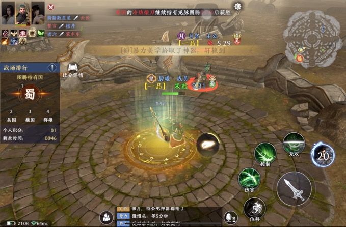 ③21:08第一波神器出现,采集后可3min携带,一般捡了就用,然后90sCD,携带到1:20左右时候还可以再使用一次神器。贯月琶可以提升伤害和移动速度,可以减轻扛旗人被追的压力