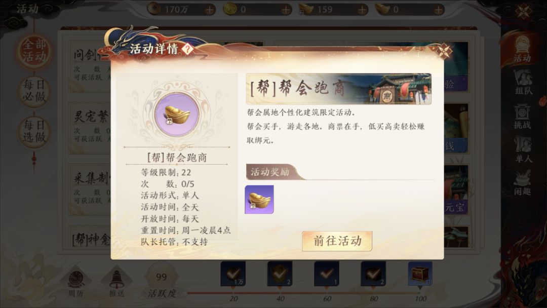 作为玩家,在游戏中肯定要想着赚钱,因为赚钱可以更快的提升战力,那我们不能漏掉的一个活动那就是帮会跑商了。