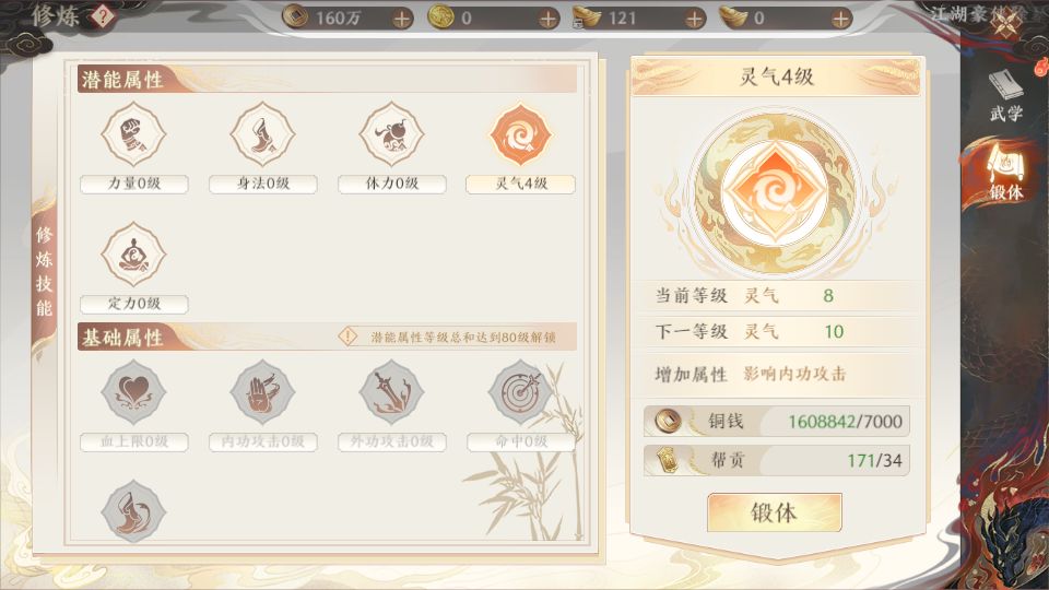 点击【武学】菜单按钮,在点击右侧锻体分类按钮即可打开锻体系统界面。